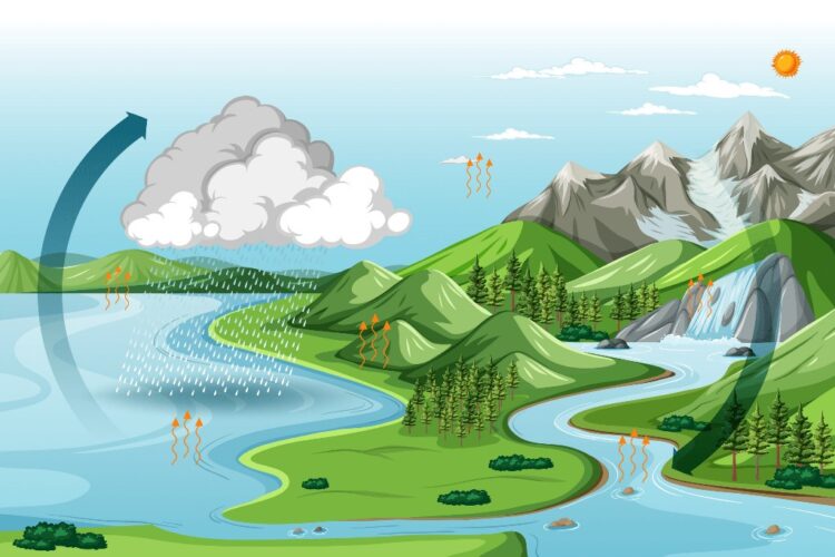Siklus air atau siklus hidrologi dimulai dari proses evaporasi—saat panas matahari menguapkan air dari laut, sungai, dan danau menjadi uap air yang naik ke atmosfer. Tumbuhan juga berperan melalui transpirasi, melepaskan uap air ke udara.